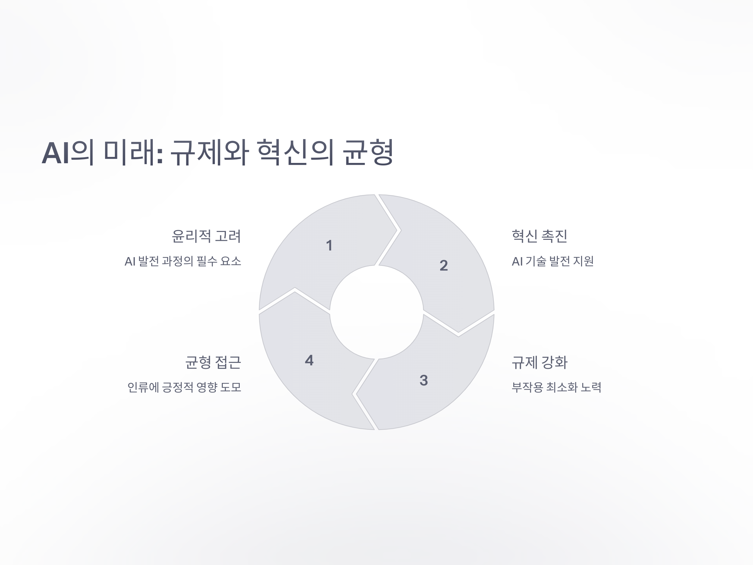 AI 기술의 발전은 피할 수 없는 흐름이지만, 그 과정에서 윤리적 문제와 사회적 영향에 대한 고려가 필수적입니다. 각국 정부와 기업, 학계는 AI의 혁신을 촉진하면서도, 윤리적 기준과 규제를 통해 부작용을 최소화하려는 노력을 기울이고 있습니다. 이러한 균형 잡힌 접근이 AI 기술이 인류에게 긍정적인 영향을 미치도록 하는 데 중요합니