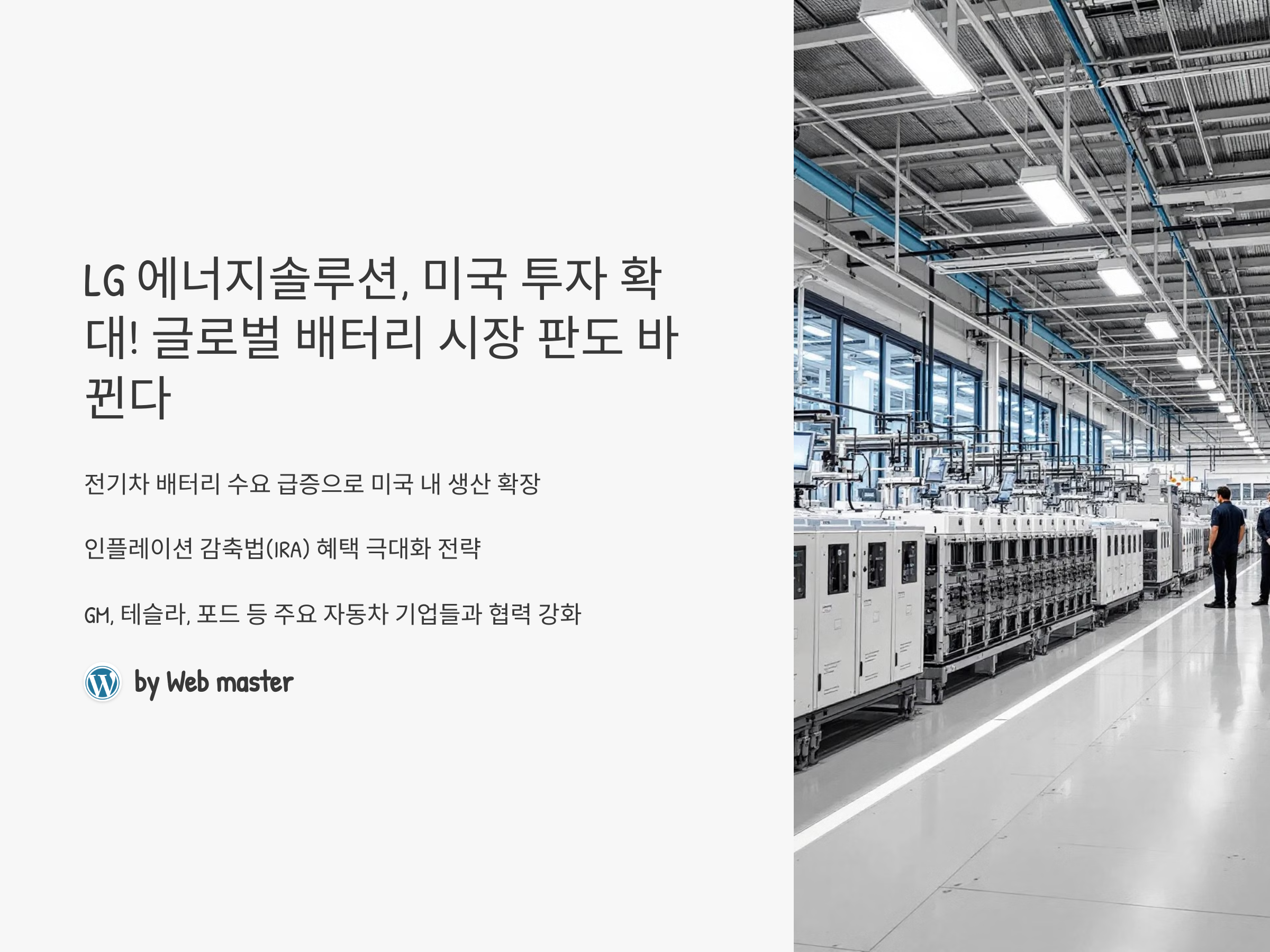 LG 에너지솔루션이 미국 시장에서 대규모 투자 확대를 발표하며 글로벌 배터리 산업의 판도를 바꿀 준비를 하고 있다. 최근 전기차(EV) 배터리 수요가 급증하면서 미국 내 생산 능력을 확장하려는 전략적 움직임이 가속화되고 있다. 이번 투자 확대는 미국 인플레이션 감축법(IRA)의 혜택을 극대화하고, 글로벌 완성차 업체들과의 협력을 더욱 강화하는 데 초점이 맞춰져 있다. 특히, 미국 내 전기차 보조금 정책과 맞물려 LG 에너지솔루션의 입지가 더욱 강화될 전망이다.