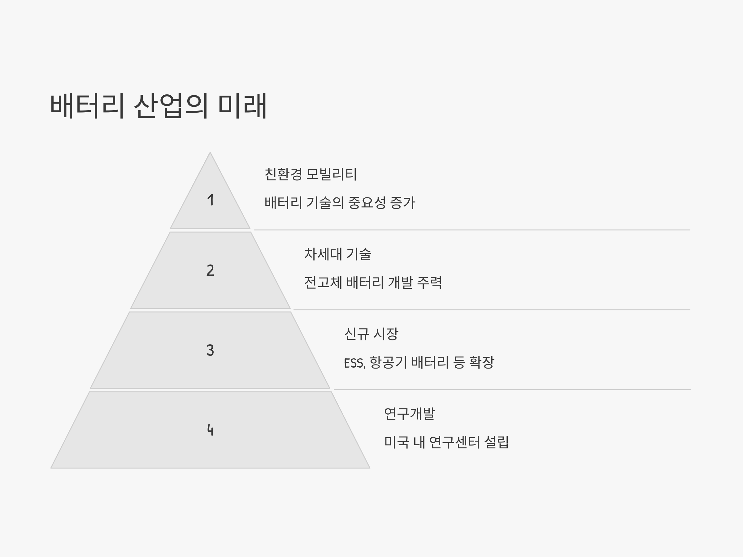 배터리 산업은 친환경 모빌리티와 신재생 에너지를 뒷받침하는 핵심 기술로 자리 잡고 있다. 전기차뿐만 아니라 ESS(에너지 저장 장치), 항공기 배터리 등 다양한 분야에서 배터리 기술의 중요성이 커지고 있다.