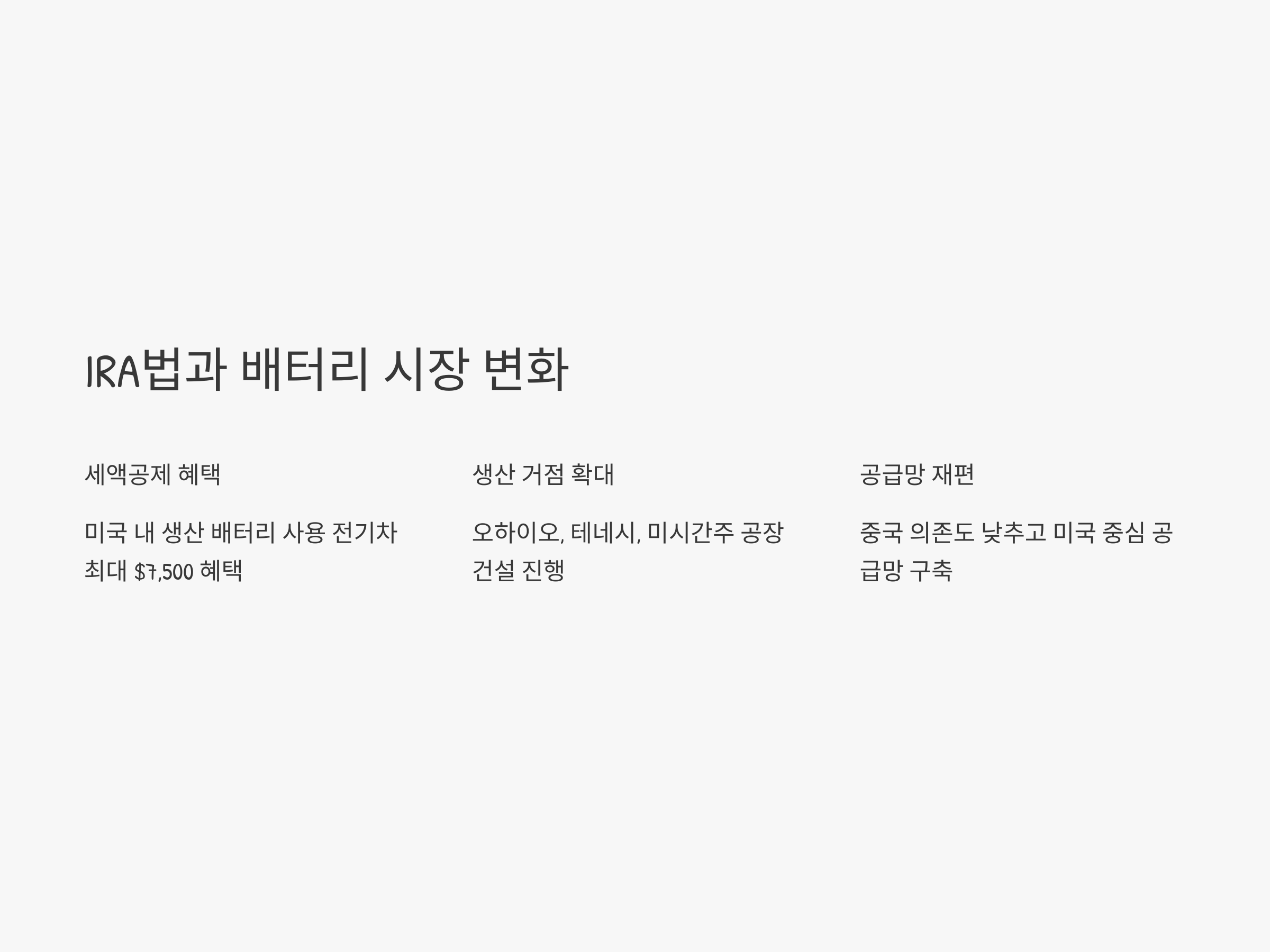 미국 정부가 2022년 발표한 인플레이션 감축법(IRA)은 전기차 배터리 시장에 큰 영향을 미쳤다. IRA에 따르면, 미국에서 생산된 배터리와 배터리 원자재를 사용한 전기차만이 최대 7,500달러의 세액공제 혜택을 받을 수 있다. 이는 LG 에너지솔루션과 같은 글로벌 배터리 제조업체가 미국 내 생산 역량을 확대하는 이유 중 하나다.