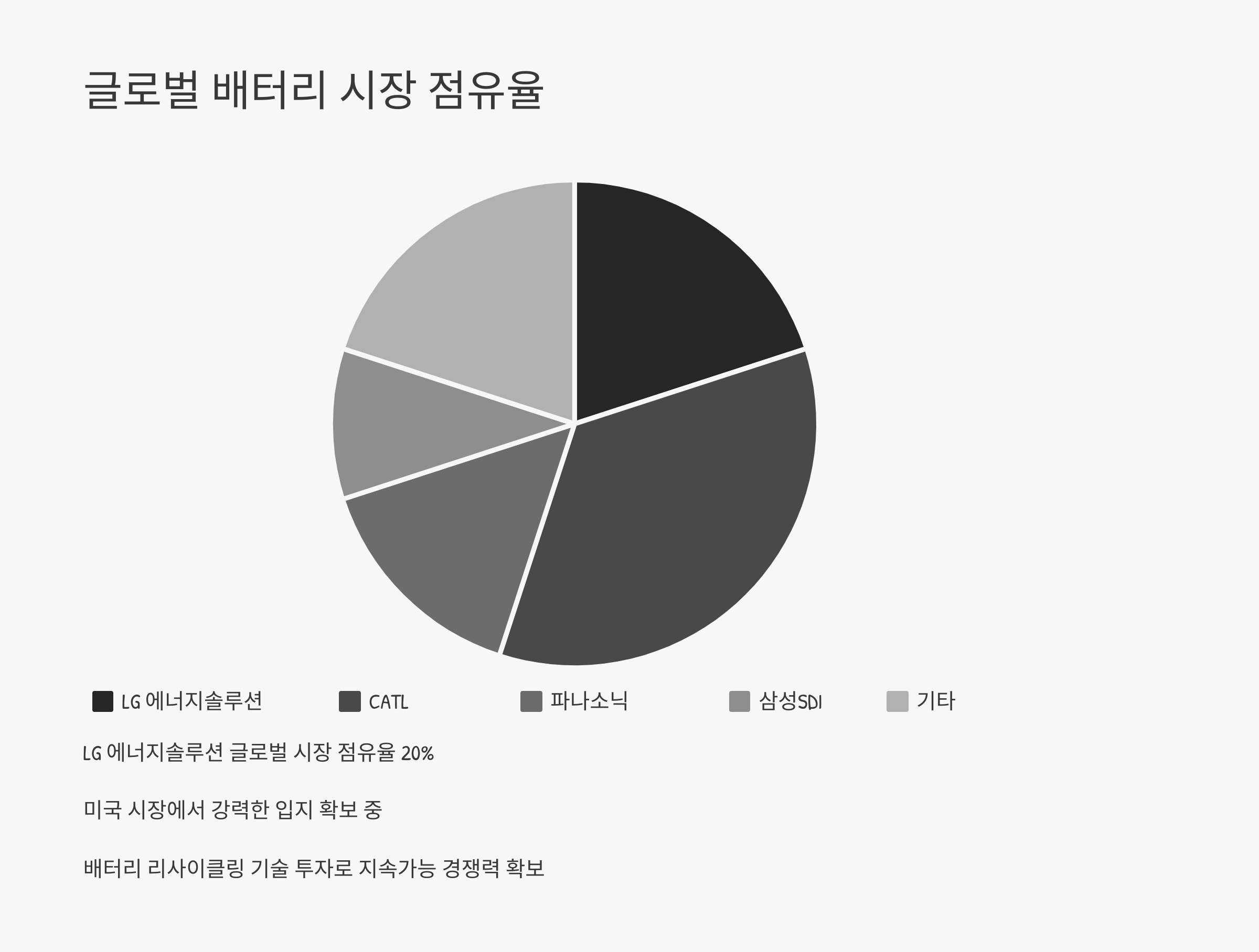 LG 에너지솔루션은 현재 글로벌 배터리 시장에서 CATL, 파나소닉, 삼성SDI와 경쟁하고 있다. 2023년 기준, LG 에너지솔루션의 글로벌 배터리 시장 점유율은 약 20%에 달하며, 미국 시장에서는 가장 강력한 배터리 공급업체 중 하나로 자리 잡고 있다.