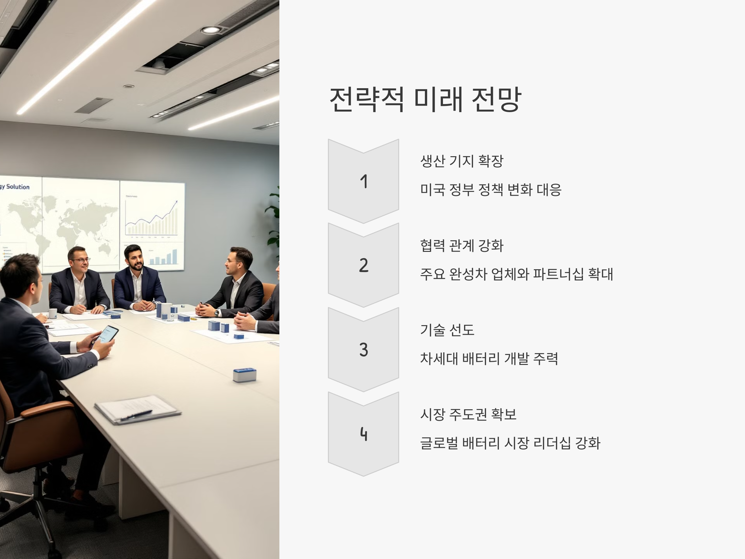 LG 에너지솔루션의 미국 투자 확대는 단순한 생산 능력 확장이 아니라, 글로벌 배터리 시장에서의 패권을 강화하기 위한 전략적인 움직임이다. 미국 정부의 정책 변화에 발맞춘 생산 기지 확장, 주요 완성차 업체들과의 협력 강화, 차세대 배터리 기술 개발 등 다각적인 전략이 함께 추진되고 있다.