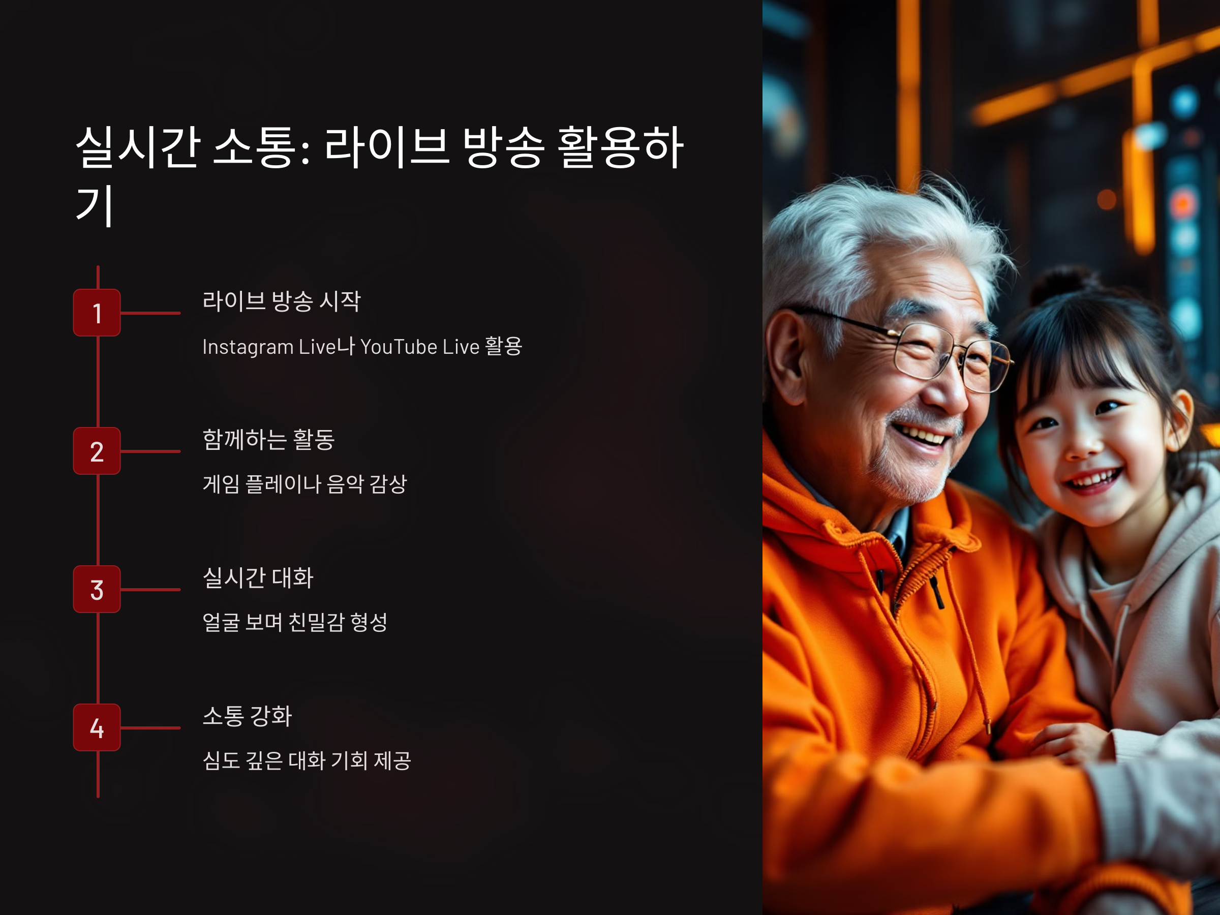 라이브 방송을 통해 손자녀와 얼굴을 마주 보며 대화하는 느낌을 받을 수 있어 더욱 친밀감을 느낄 수 있습니다. 이는 특히 먼 거리에서 소통할 때 유용한 방법입니다.