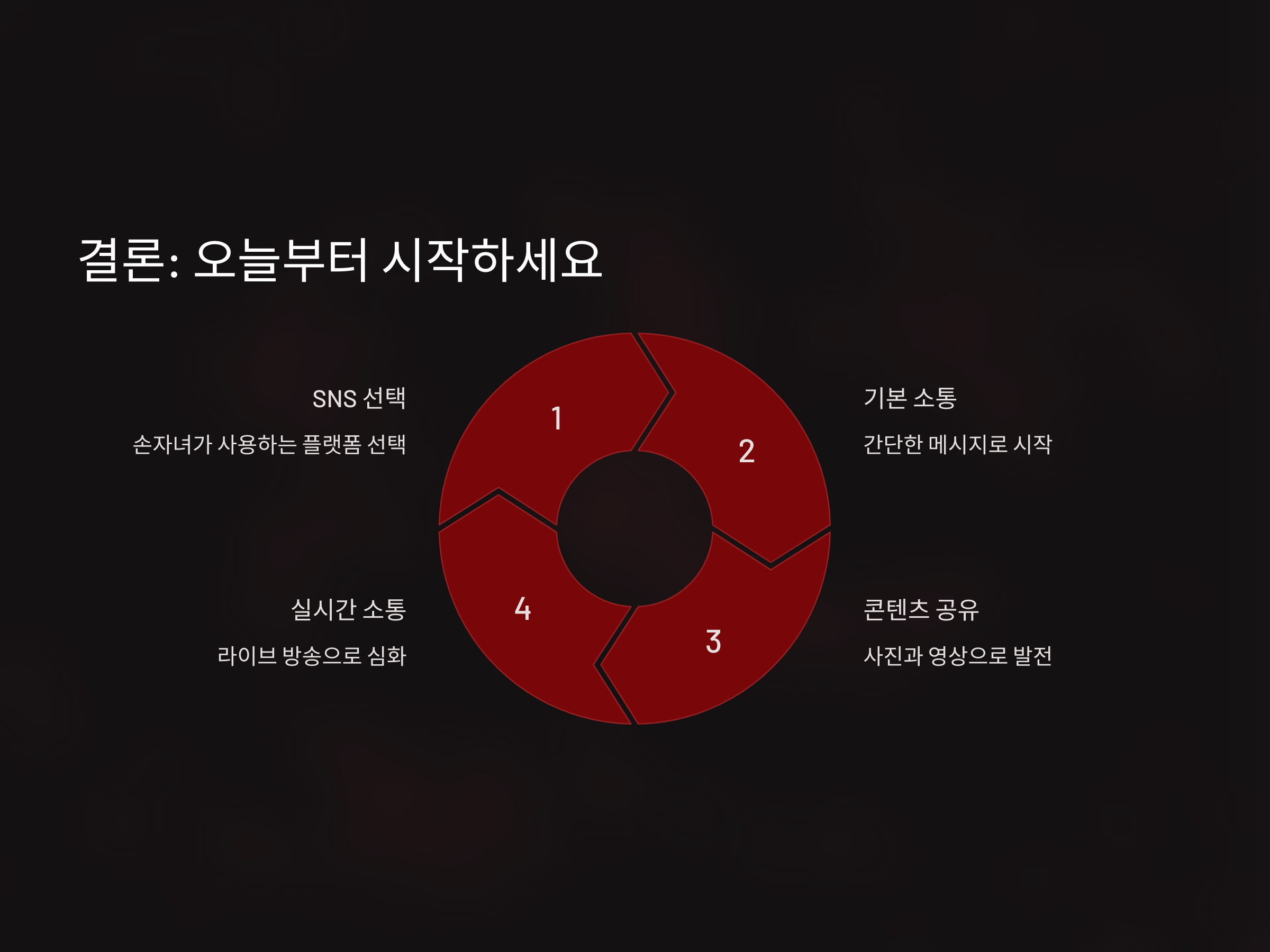 SNS를 활용해 손자녀와 소통하는 방법은 생각보다 쉽고 재미있습니다. 텍스트 메시지, 사진, 영상, 라이브 방송을 활용하면 다양한 방식으로 손자녀와 소통할 수 있습니다. 또한, SNS는 물리적인 거리를 뛰어넘어 실시간으로 연결할 수 있는 좋은 방법이므로, 서로의 일상을 공유하고 관계를 더욱 강화하는 데 큰 도움이 됩니다.