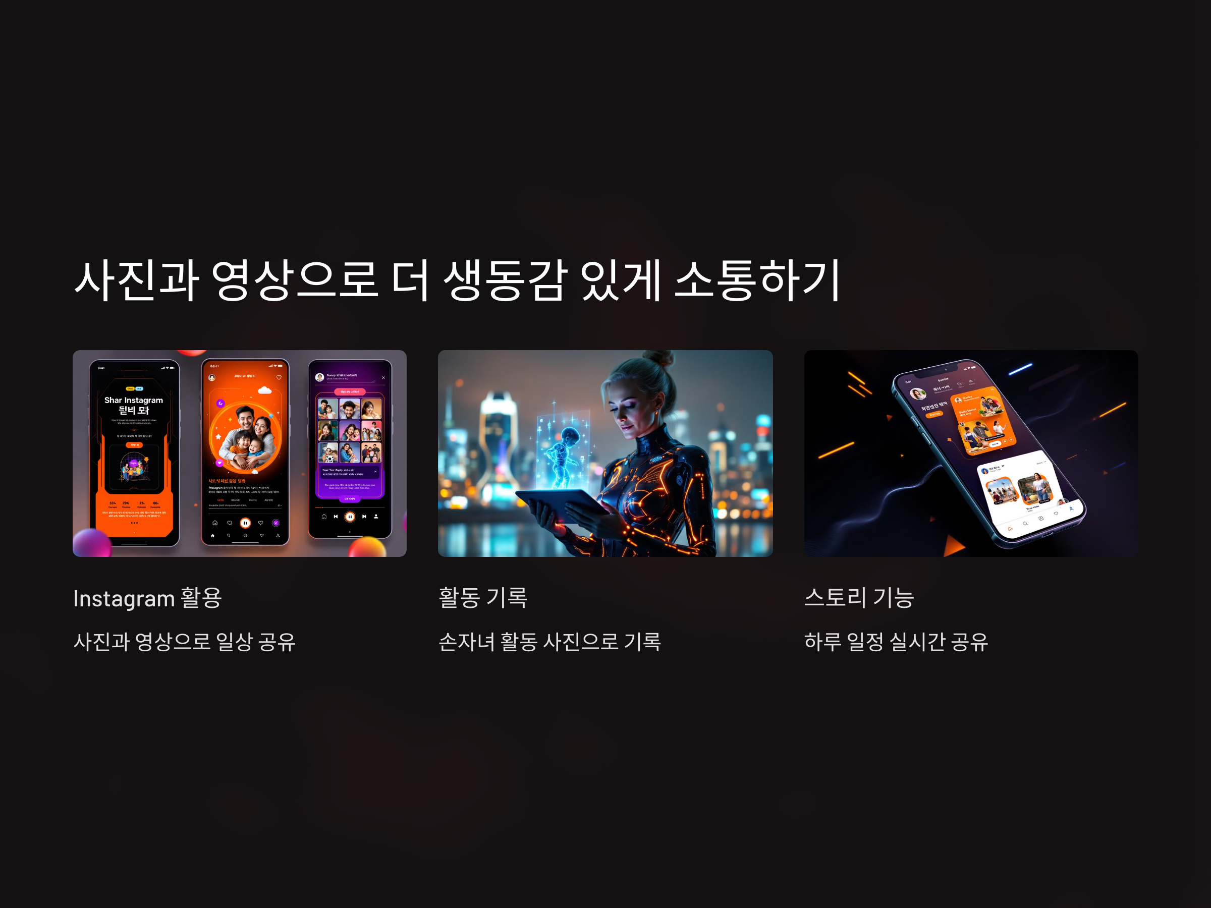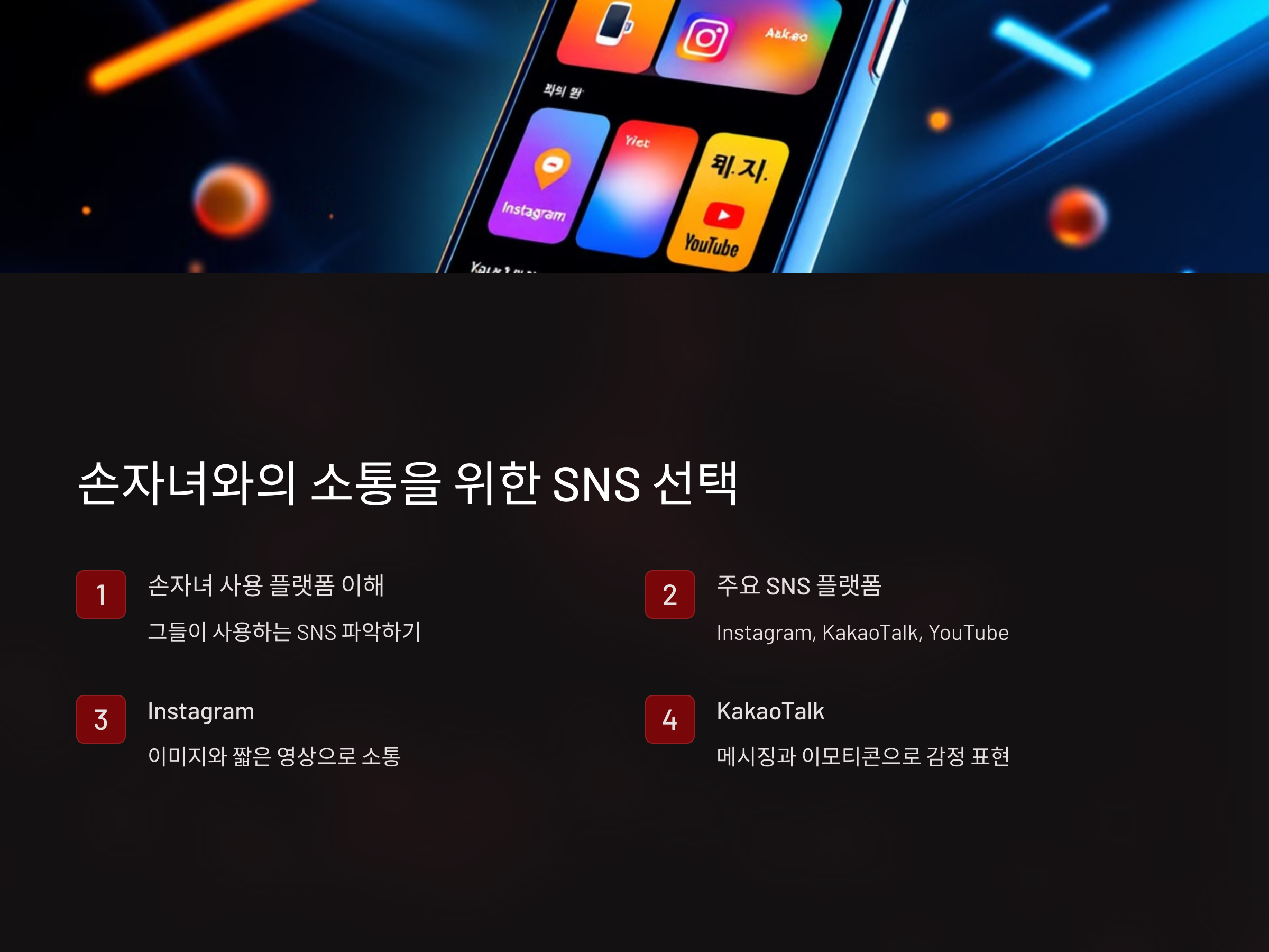 대부분의 젊은 세대, 특히 손자녀들은 Instagram, KakaoTalk, YouTube 등과 같은 SNS를 주로 사용합니다. 이들 플랫폼은 모바일 중심으로 디자인되어 있어 사용이 직관적이며, 텍스트 메시지, 이미지, 영상 등을 쉽게 공유할 수 있습니다. 이를 통해 손자녀와 실시간으로 소통하거나, 사진과 영상을 공유해 특별한 순간을 나눌 수 있습니다.