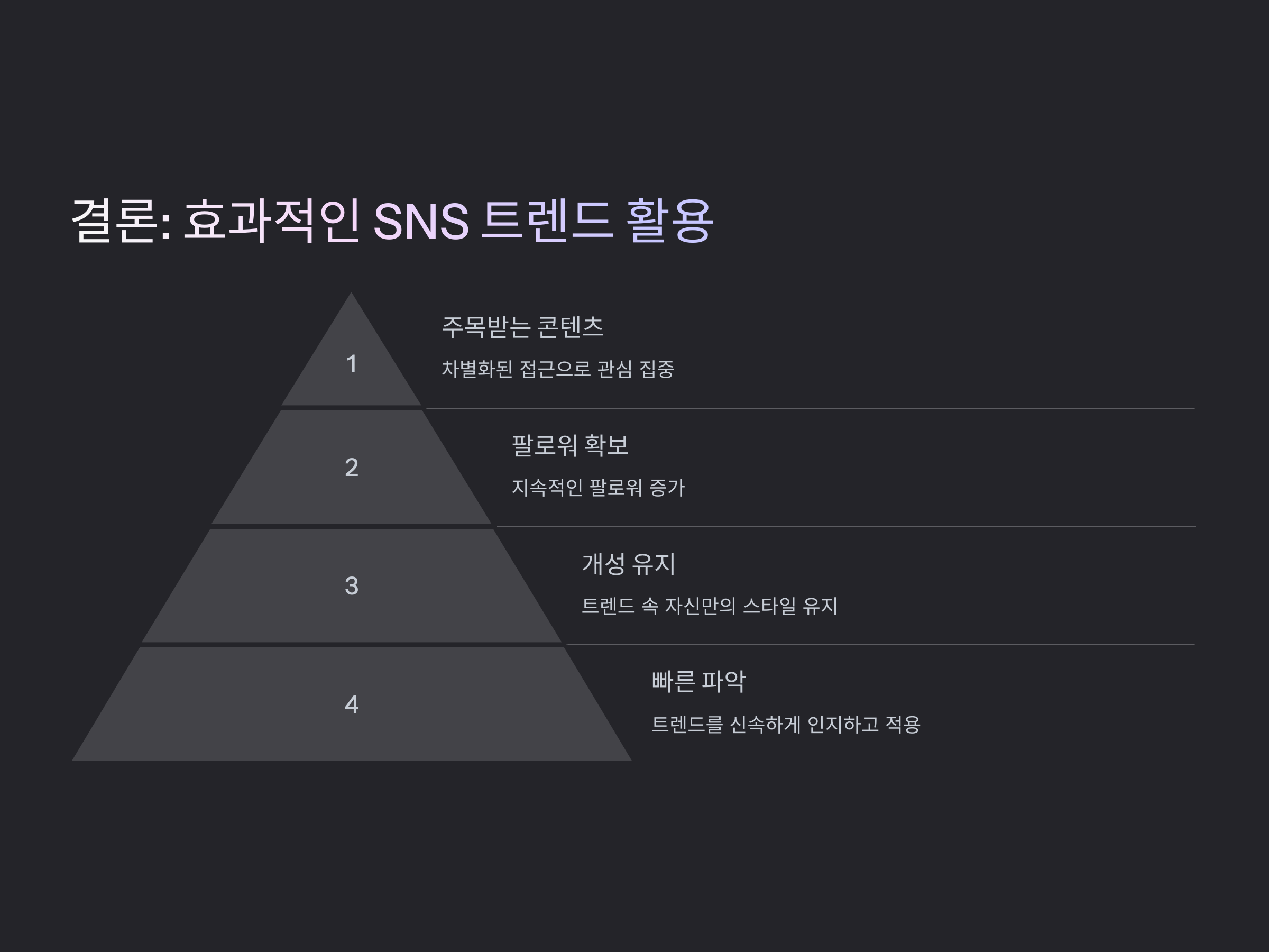 SNS에서 유행하는 트렌드는 빠르게 변하고, 그 속도를 따라잡기 어려운 경우도 많습니다. 하지만 트렌드를 빠르게 파악하고, 나만의 스타일로 변형하여 콘텐츠에 반영하면, 더욱 효과적으로 SNS에서 주목받을 수 있습니다. 트렌드를 잘 활용하면 단기적인 인기뿐만 아니라, 지속적인 팔로워 확보에도 큰 도움이 될 것입니다. 결국 트렌드를 따라가는 것도 중요하지만, 그것을 내 스타일에 맞게 활용하는 것이 더 중요하다는 사실을 기억하세요.