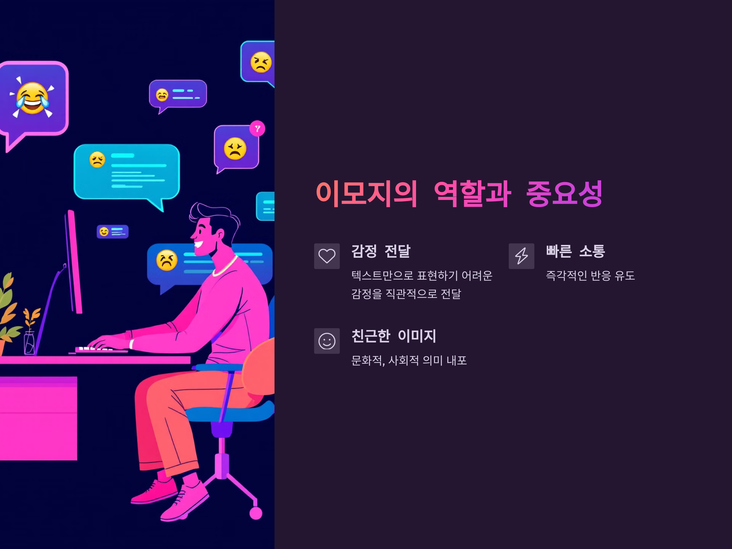 SNS에서는 사용자가 이모지를 보고 즉각적으로 반응할 수 있기 때문에, 빠르고 직관적인 소통이 가능해집니다. 특히 젊은 세대는 감정을 더 쉽게 표현하려는 경향이 있어, 이모지를 활용한 소통이 더 효과적일 수 있습니다. 또한, 특정 이모지에는 문화적, 사회적 의미가 내포되어 있어, 이를 활용하는 것만으로도 SNS 상에서 더욱 친근한 이미지를 형성할 수 있습니다.
