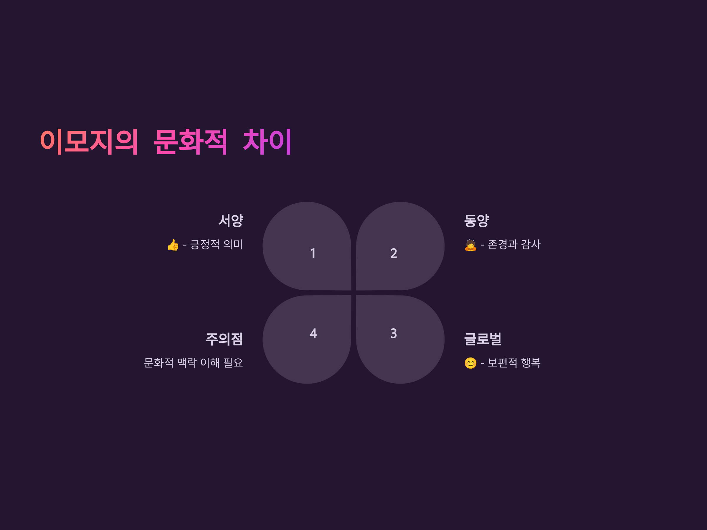 특히 글로벌 소셜미디어에서 이모지를 사용할 때는 이러한 문화적 맥락을 이해하는 것이 중요합니다. 같은 이모지도 나라나 문화에 따라 다르게 해석될 수 있기 때문에, 글로벌 브랜드나 사용자라면 이모지 사용에 있어 신중해야 합니다. 젊은 세대는 글로벌한 인식을 가지고 있으므로, 다양한 문화에서 긍정적인 반응을 얻을 수 있는 이모지를 사용해야 합니다.