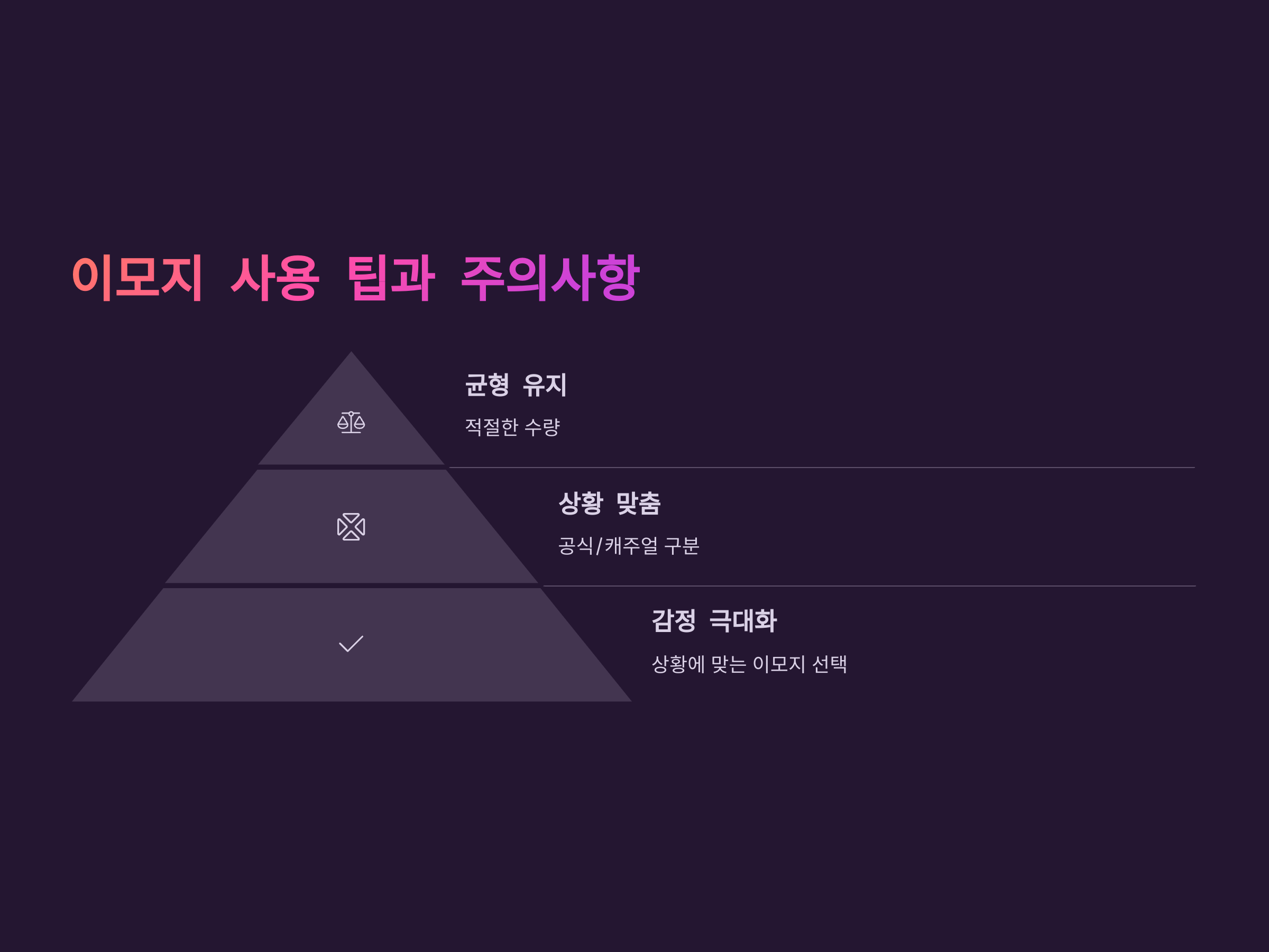 또한, 이모지는 항상 대상에 맞는 톤으로 사용해야 합니다. 예를 들어, 기업의 공식적인 메시지나 중요한 공지사항에 너무 많은 이모지를 사용하면 전문성이 떨어질 수 있습니다. 반대로, 캐주얼하고 친근한 분위기의 소통에서는 이모지를 자유롭게 활용하는 것이 좋습니다.