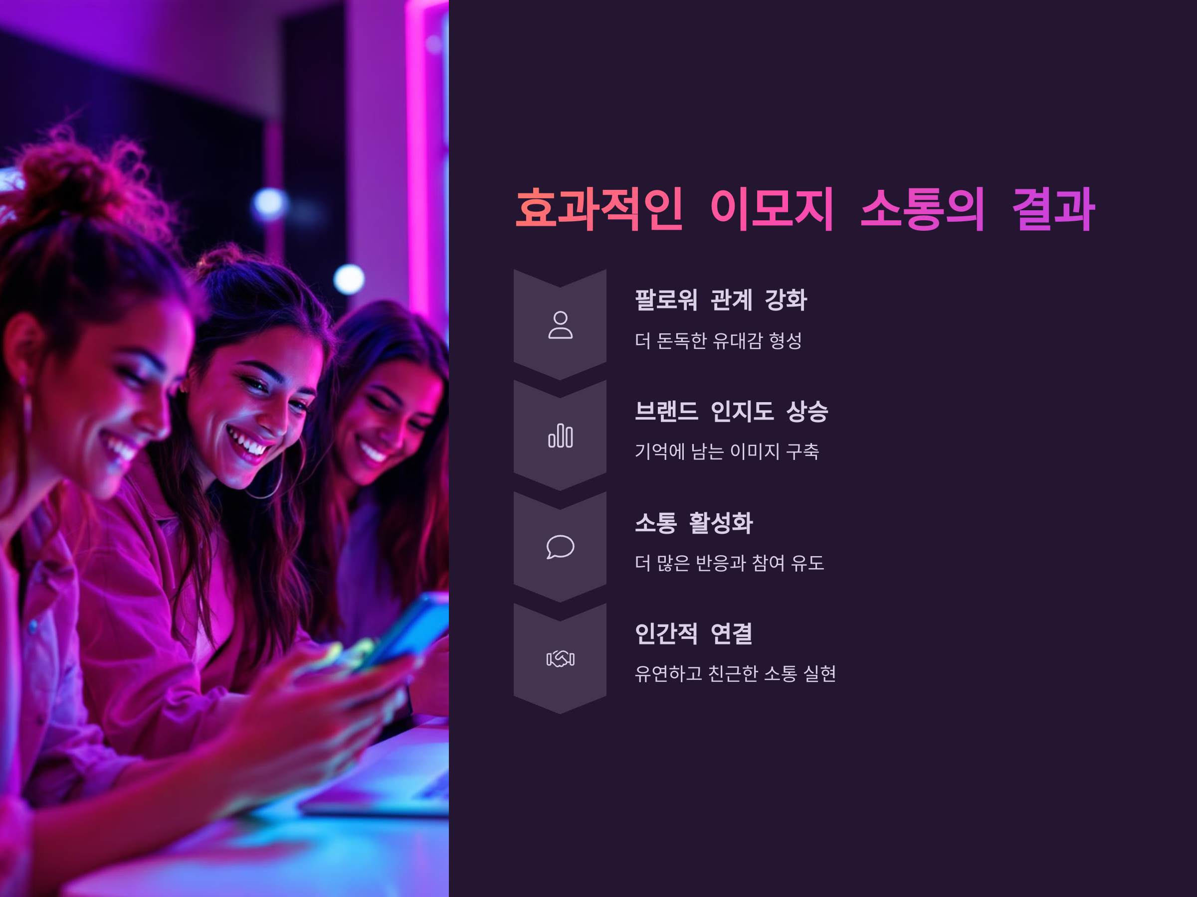 이모지를 효과적으로 활용하면 단순한 텍스트 메시지가 감동적이고 재미있게 변합니다. 이모지를 통해 메시지에 감정을 입히고, 팔로워들과의 상호작용을 늘리며, 브랜드의 이미지나 개성을 강조할 수 있습니다. 특히 젊은 세대는 빠르게 변화하는 트렌드에 민감하기 때문에, 이모지의 사용은 소통을 더욱 자연스럽고 친근하게 만들어 줍니다.