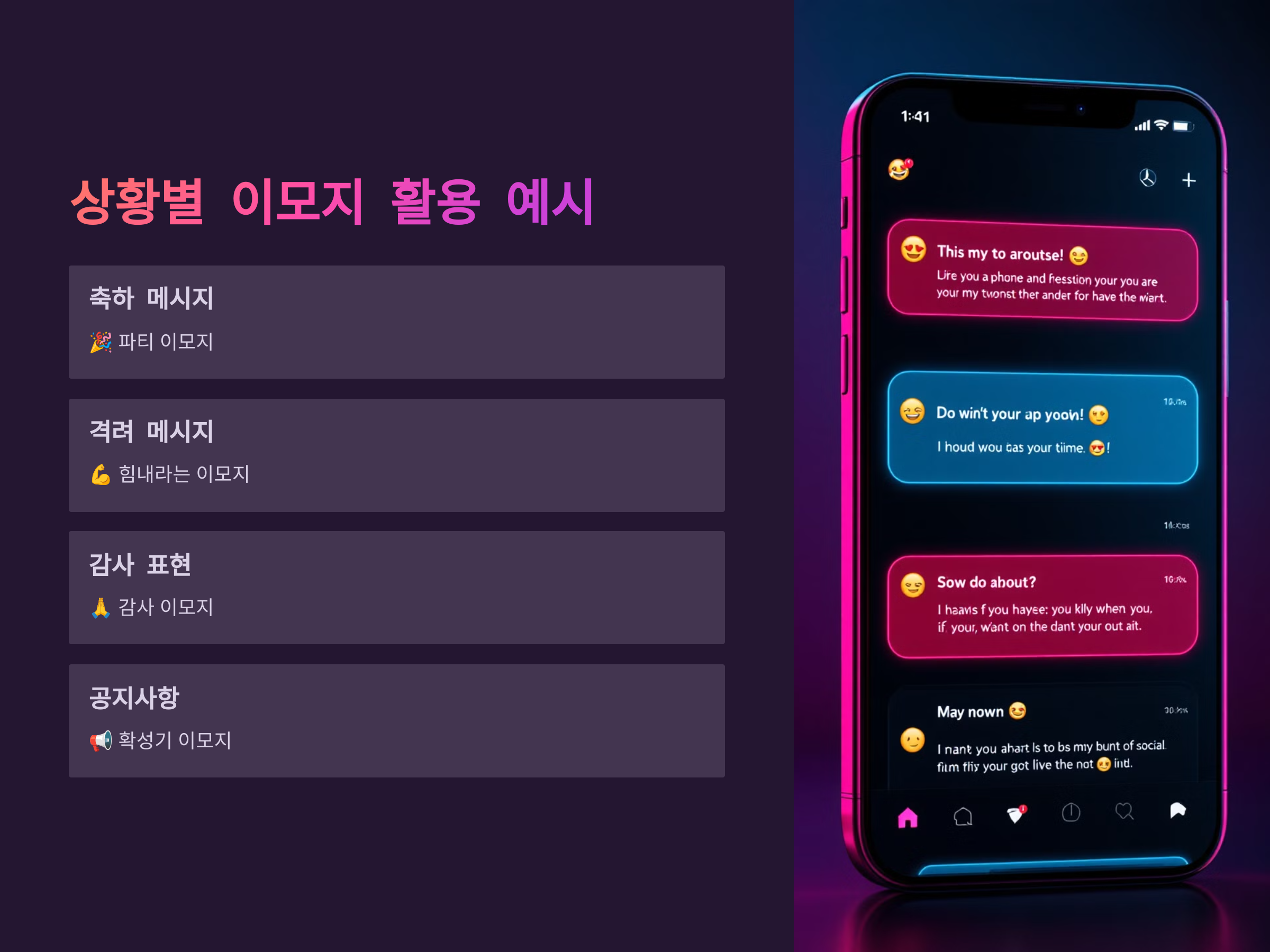 이모지는 메시지의 감정을 극대화하는 도구이므로, 상황에 맞는 이모지를 사용하는 것이 핵심입니다. 예를 들어, 축하하는 메시지에는 "🎉" (파티 이모지), 격려하는 메시지에는 "💪" (힘내라는 이모지)를 사용하면 좋습니다.