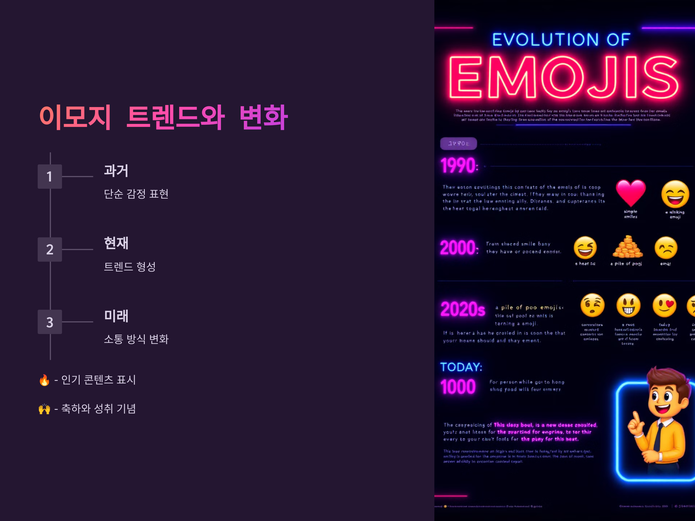예를 들어, 최근 "🔥" (불꽃) 이모지는 열정을 나타내는 것 외에도 인기 있는 콘텐츠나 이벤트를 나타내는 데 자주 사용됩니다. 또, "🙌" (두 손을 든 이모지)은 축하의 의미로 많이 사용되고, 때로는 사람들이 성취를 기념하는 데 사용되기도 합니다. 이렇게 특정 이모지의 의미가 시간이 지나면서 변화하거나 확장되므로, 최신 트렌드에 맞게 이모지를 사용하면 더욱 젊은 세대와 자연스러운 소통이 가능합니다.