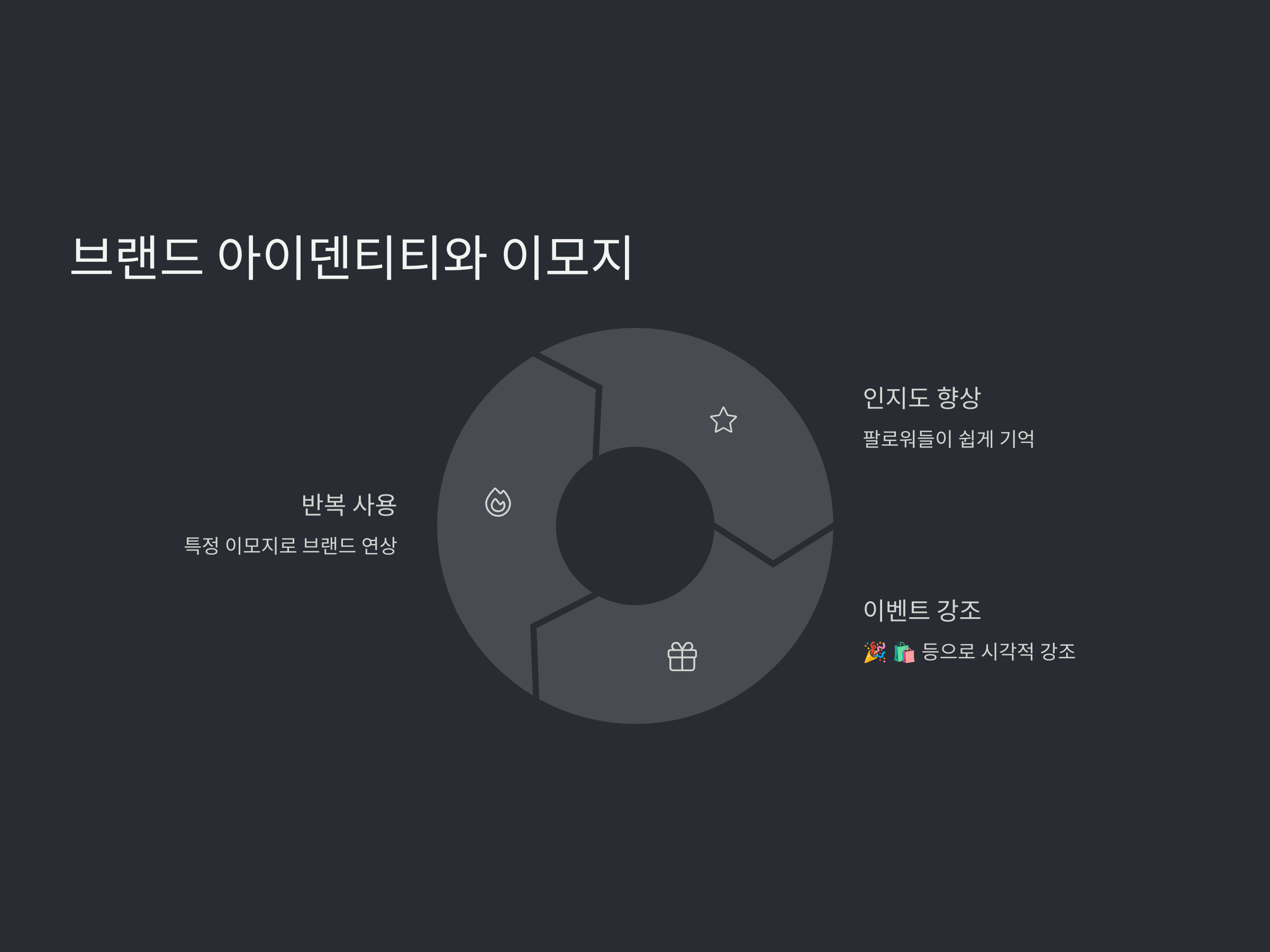 이렇게 이모지를 브랜드 아이덴티티와 결합하면, 팔로워들이 쉽게 기억할 수 있고, SNS 상에서 인지도를 높이는 데 도움이 됩니다. 예를 들어, 신제품 출시나 특별 이벤트를 알릴 때 "🎉" (축하 이모지)나 "🛍️" (쇼핑 이모지) 등을 활용하여 시각적으로 강조할 수 있습니다.