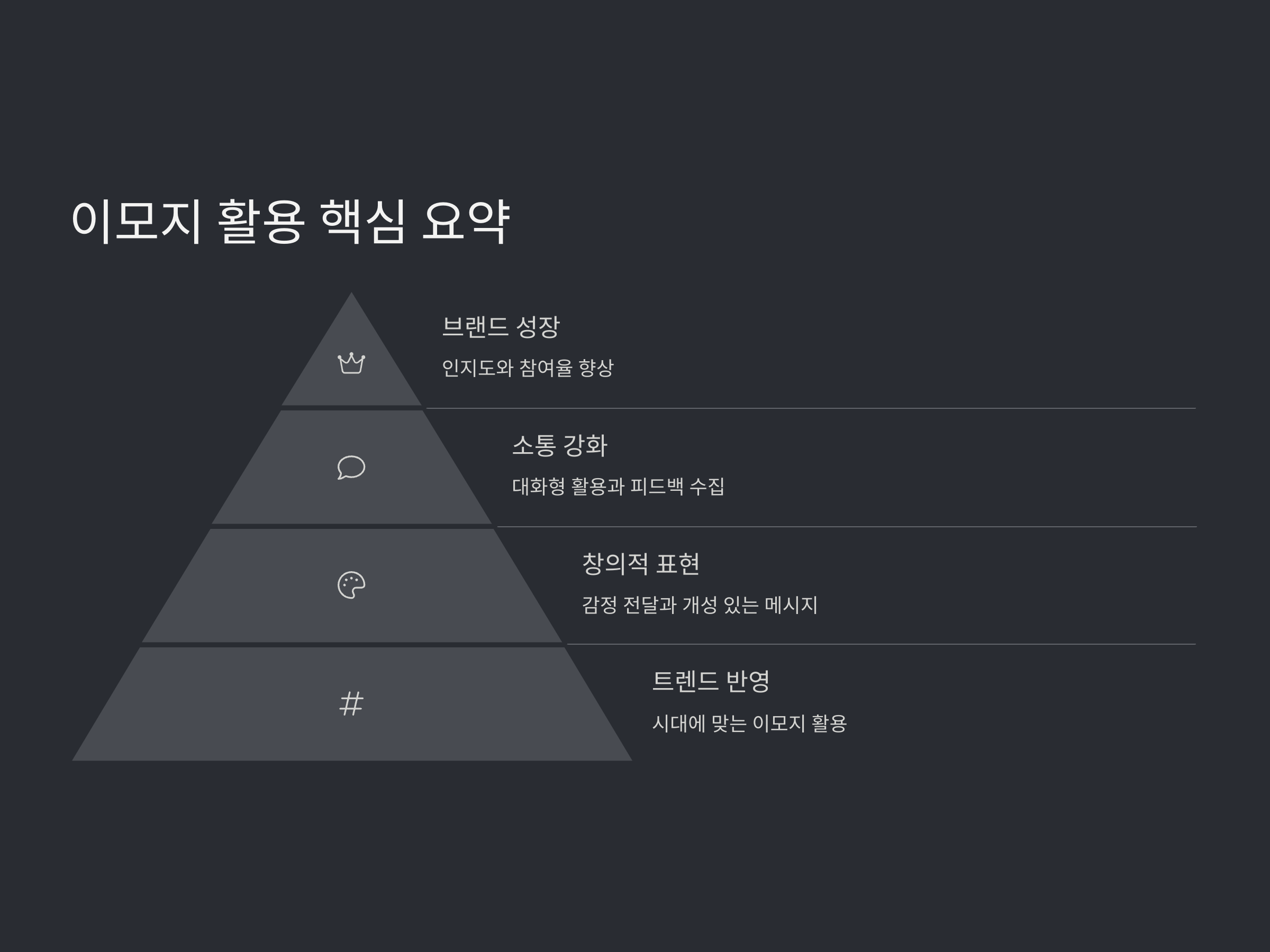 브랜드나 개인의 SNS 계정에서는 이모지를 활용해 아이덴티티를 강화할 수 있습니다. 특정 이모지를 반복적으로 사용하면, 팔로워들에게 그 브랜드나 인물이 연상될 수 있기 때문입니다. 예를 들어, 어떤 브랜드가 지속적으로 "🔥" 이모지를 사용한다면, 그것은 그 브랜드의 아이콘처럼 인식될 수 있습니다.