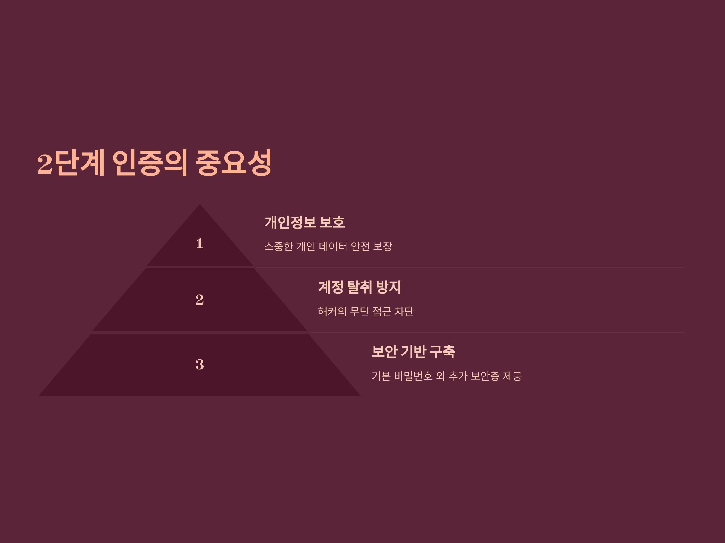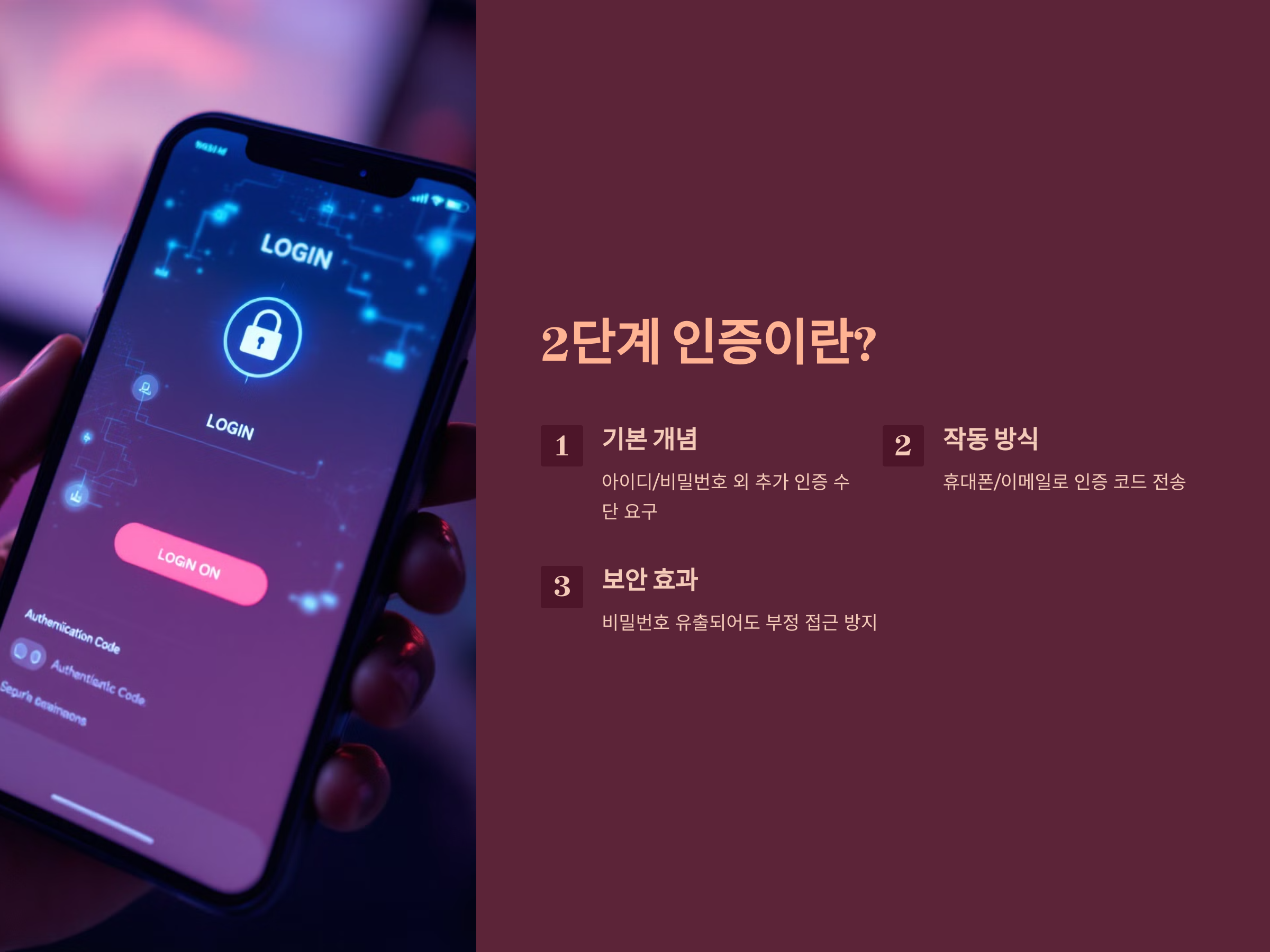 2단계 인증은 기본적인 아이디와 비밀번호 외에 추가적인 인증 수단을 요구하는 보안 절차입니다. 일반적으로 로그인 시도 시, 등록된 휴대폰 번호나 이메일로 전송된 인증 코드를 입력해야만 접근이 허용됩니다. 이를 통해 비밀번호가 유출되더라도 추가적인 인증 절차로 인해 부정 접근을 방지할 수 있습니다.