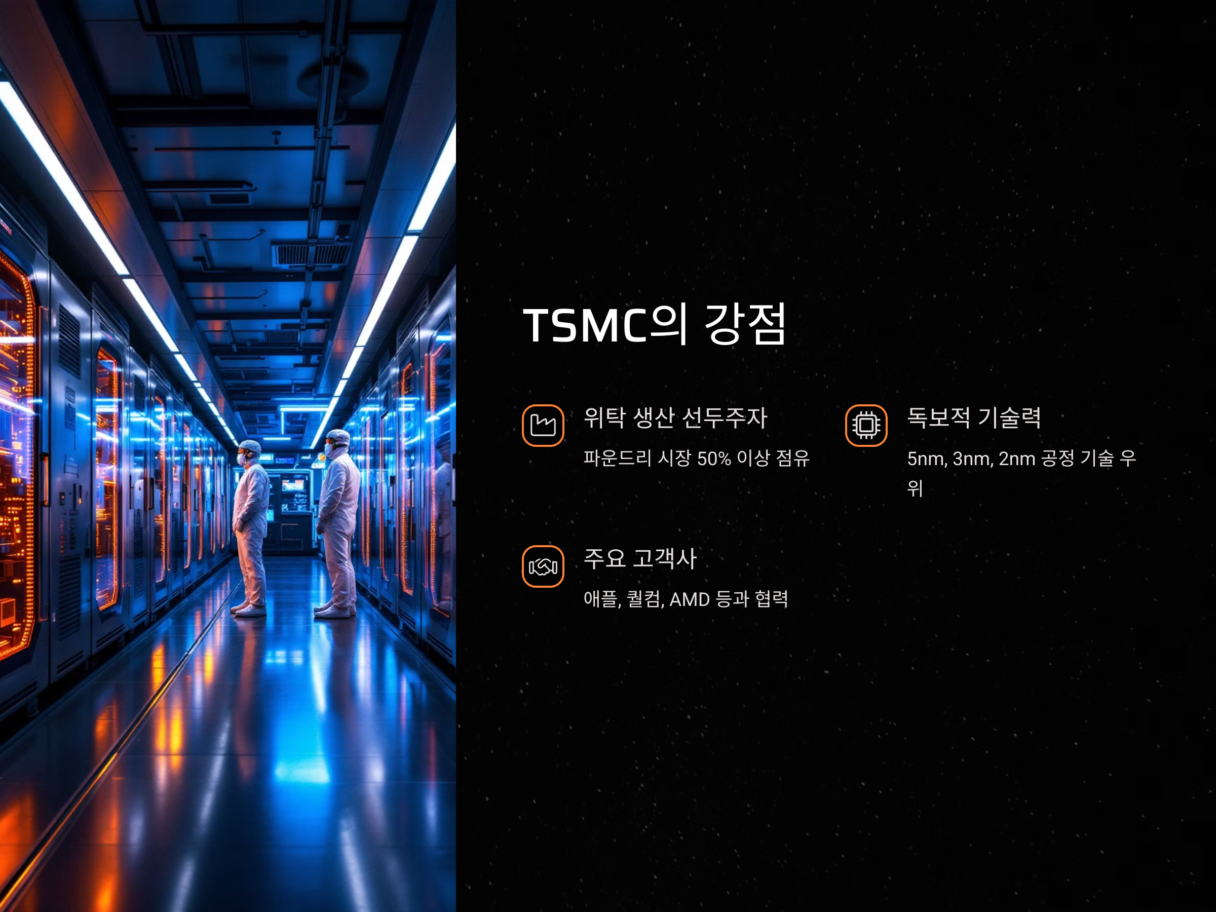 TSMC는 반도체 제조 공정에 대한 독보적인 기술력을 자랑하며, 위탁 생산 시장에서 글로벌 리더로 자리매김하고 있습니다. 회사는 자사의 공정을 외부 고객에게 제공하는 전략을 택하고 있으며, 그 결과 애플, 퀄컴, AMD 등 주요 IT 기업들과 협력하고 있습니다. TSMC는 5nm, 3nm, 그리고 최신 2nm 공정 기술을 기반으로 한 칩 생산에서 우위를 점하고 있으며, 이는 그들의 시장 점유율 확대에 크게 기여하고 있습니다.