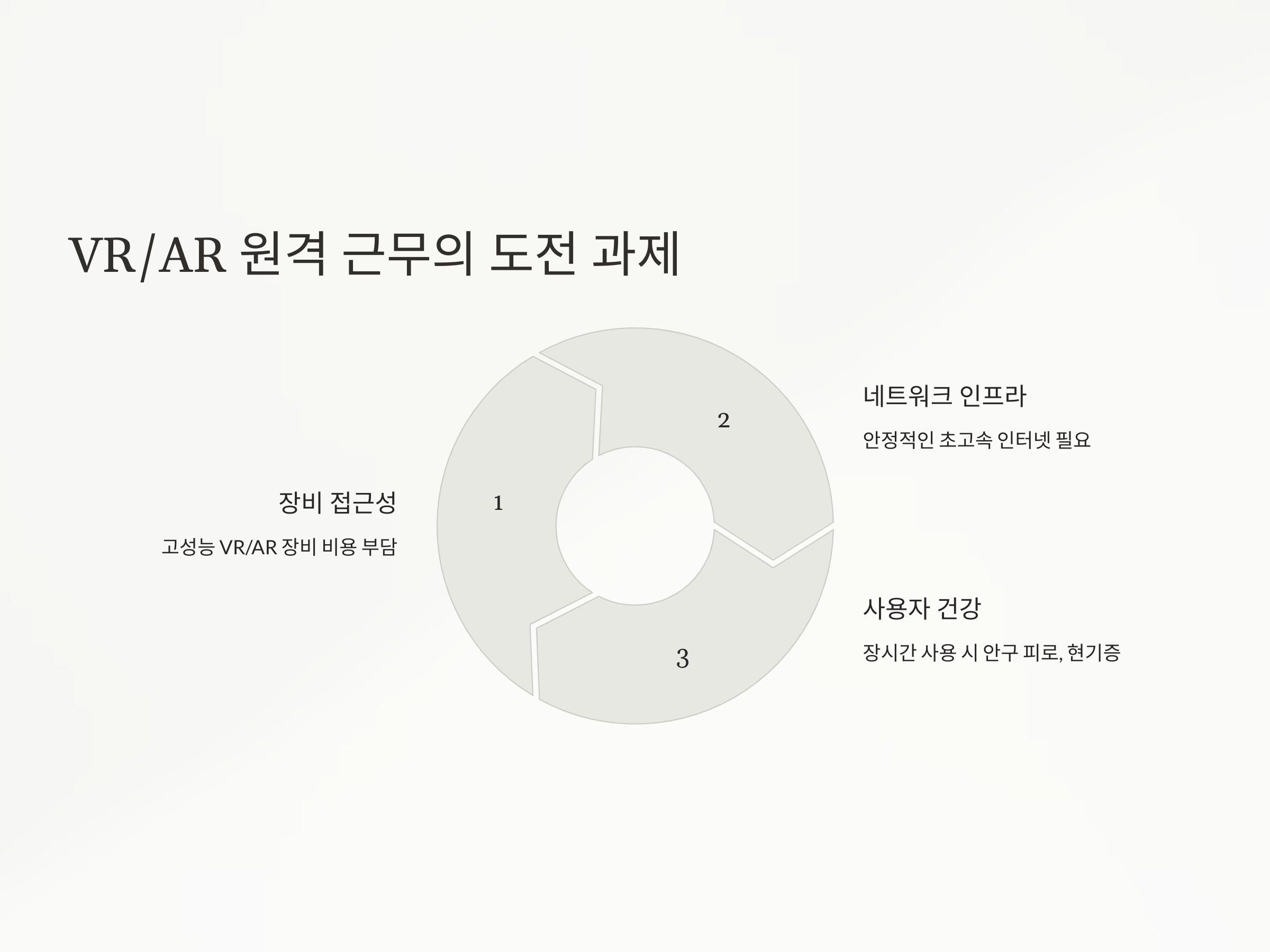 VR/AR 기반 원격 근무가 보편화되기 위해서는 다음과 같은 과제들이 해결되어야 합니다: