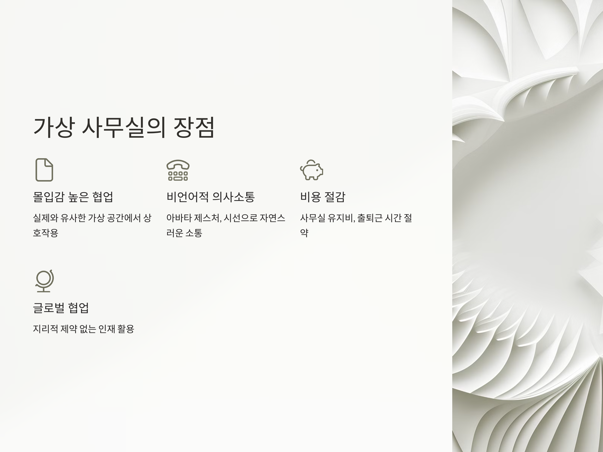 VR/AR 기반 가상 사무실은 다음과 같은 이점을 제공합니다: