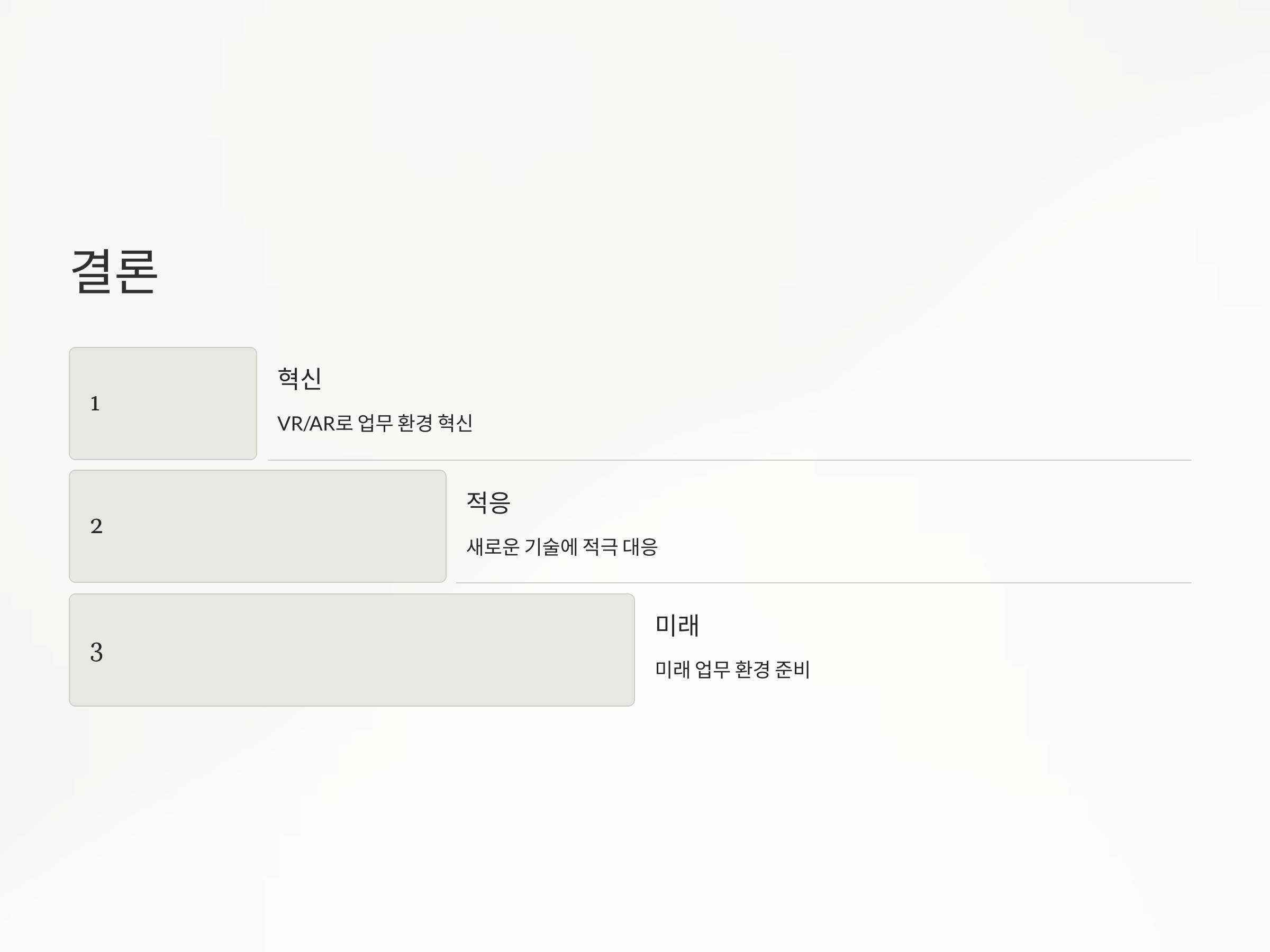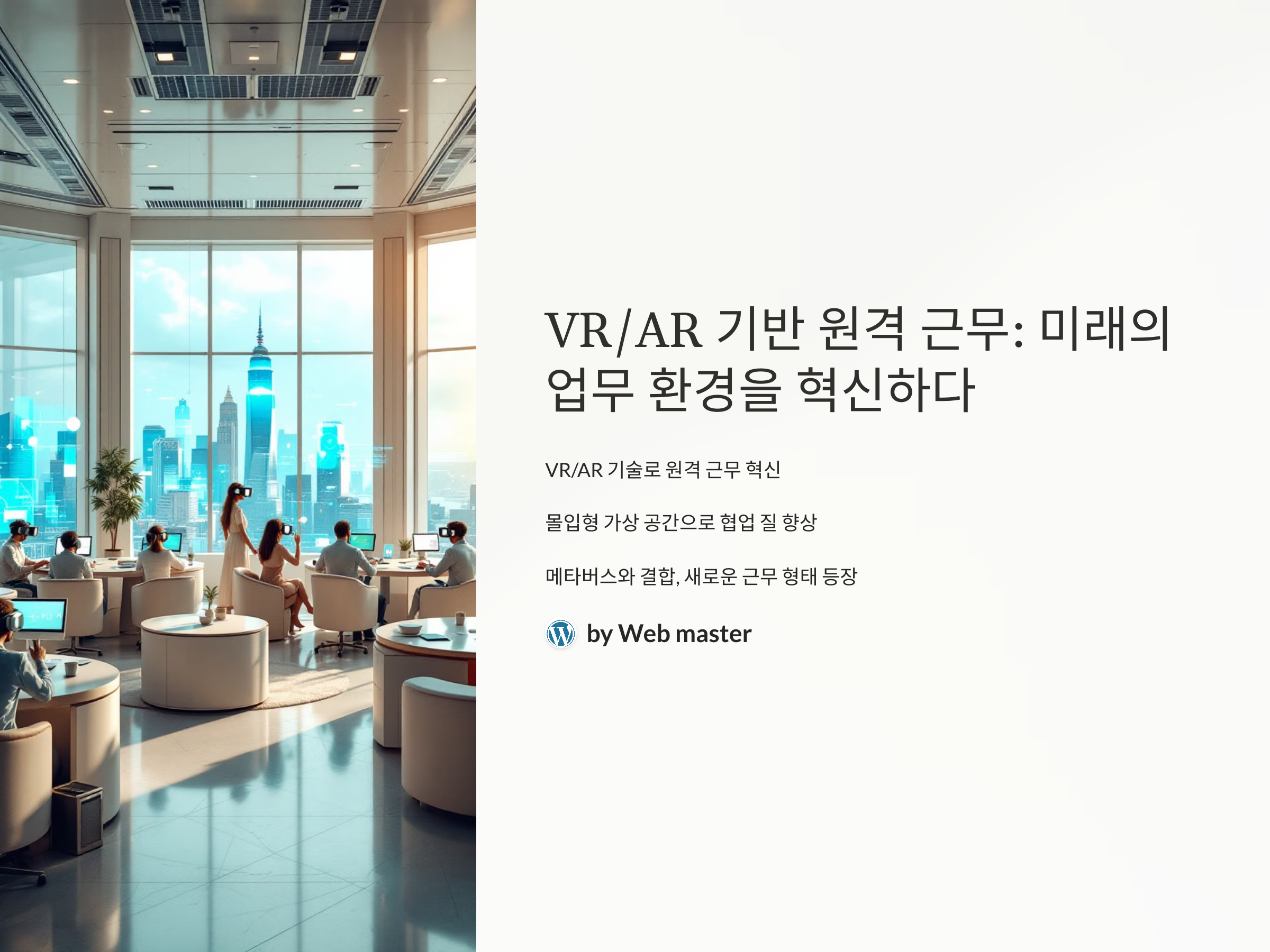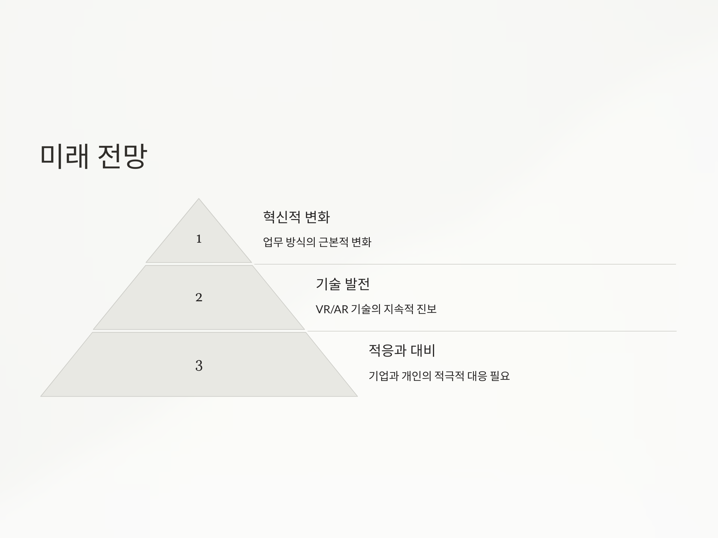 VR/AR 기반 원격 근무는 기존의 업무 방식을 혁신적으로 변화시키고 있습니다. 기술의 발전과 함께 이러한 변화는 더욱 가속화될 것이며, 기업과 개인 모두 이러한 흐름에 적극적으로 대응하여 미래의 업무 환경에 대비해야 할 것입니다.