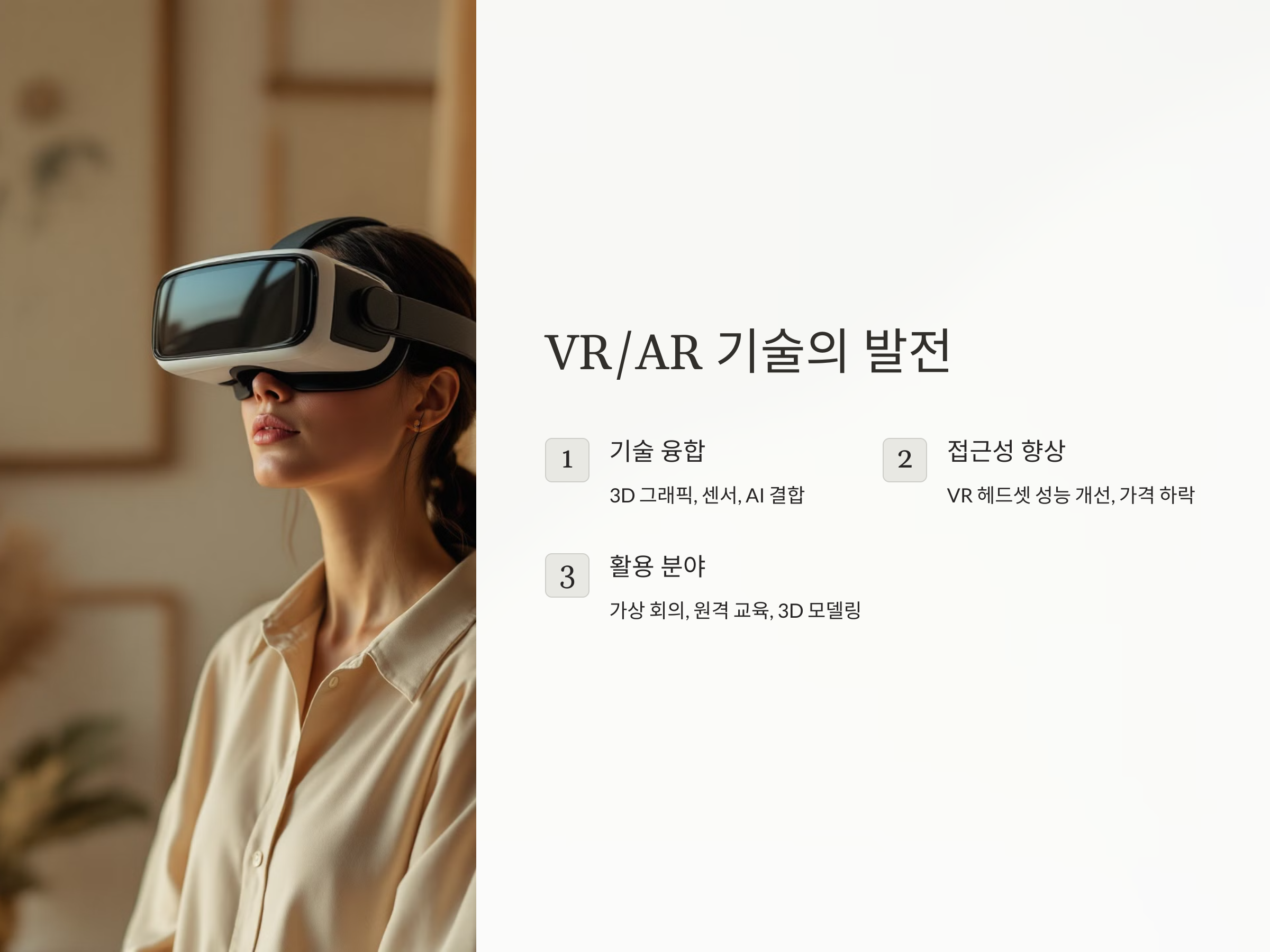 - 장비 접근성: 고성능 VR/AR 장비의 비용 부담을 줄여야 합니다.