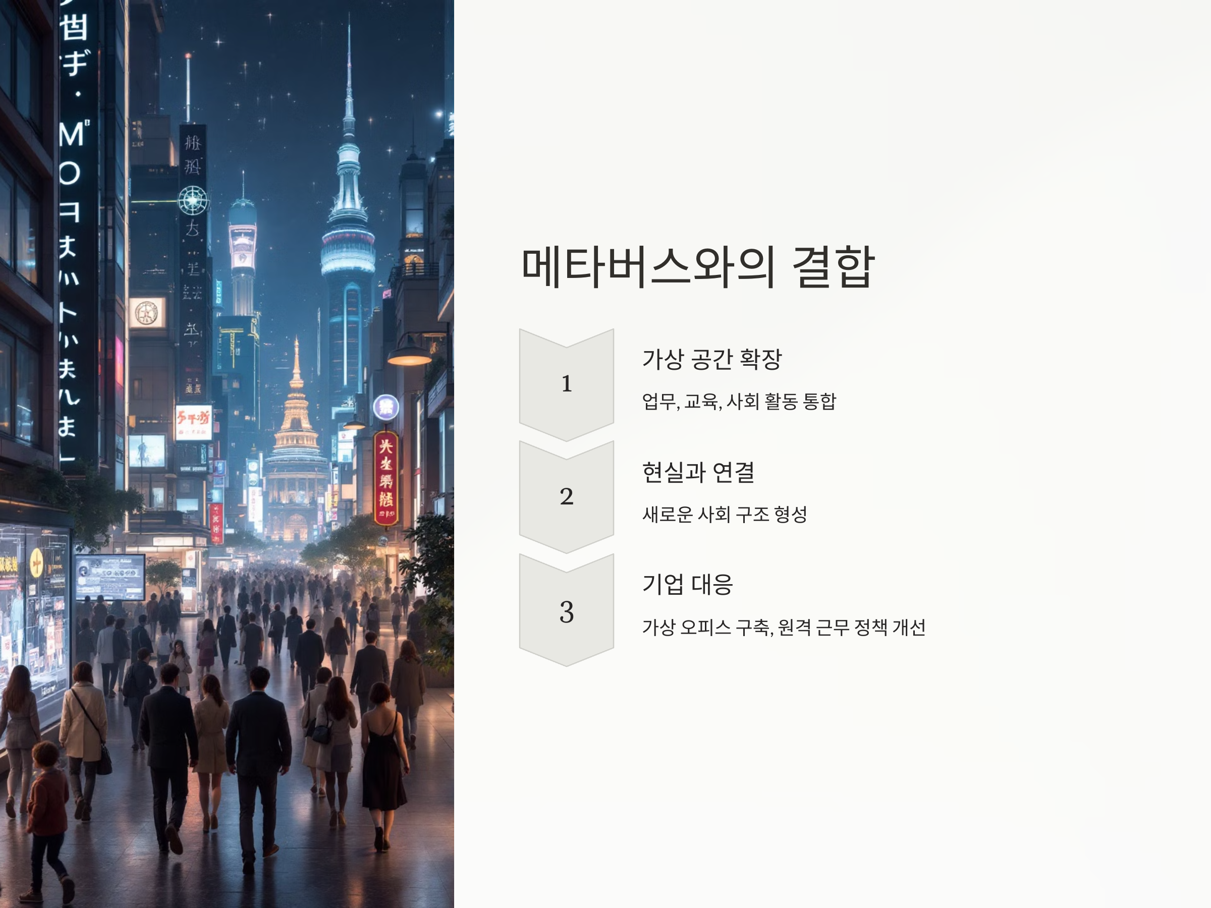 VR/AR 기술은 메타버스와의 결합을 통해 더욱 발전할 것으로 예상됩니다. 가상 공간에서의 업무, 교육, 사회 활동 등이 현실 세계와 긴밀하게 연결되어 새로운 형태의 사회 구조를 형성할 것입니다. 기업들은 이러한 변화에 대비하여 가상 오피스 구축, 원격 근무 정책 개선 등 선제적인 대응이 필요합니다.