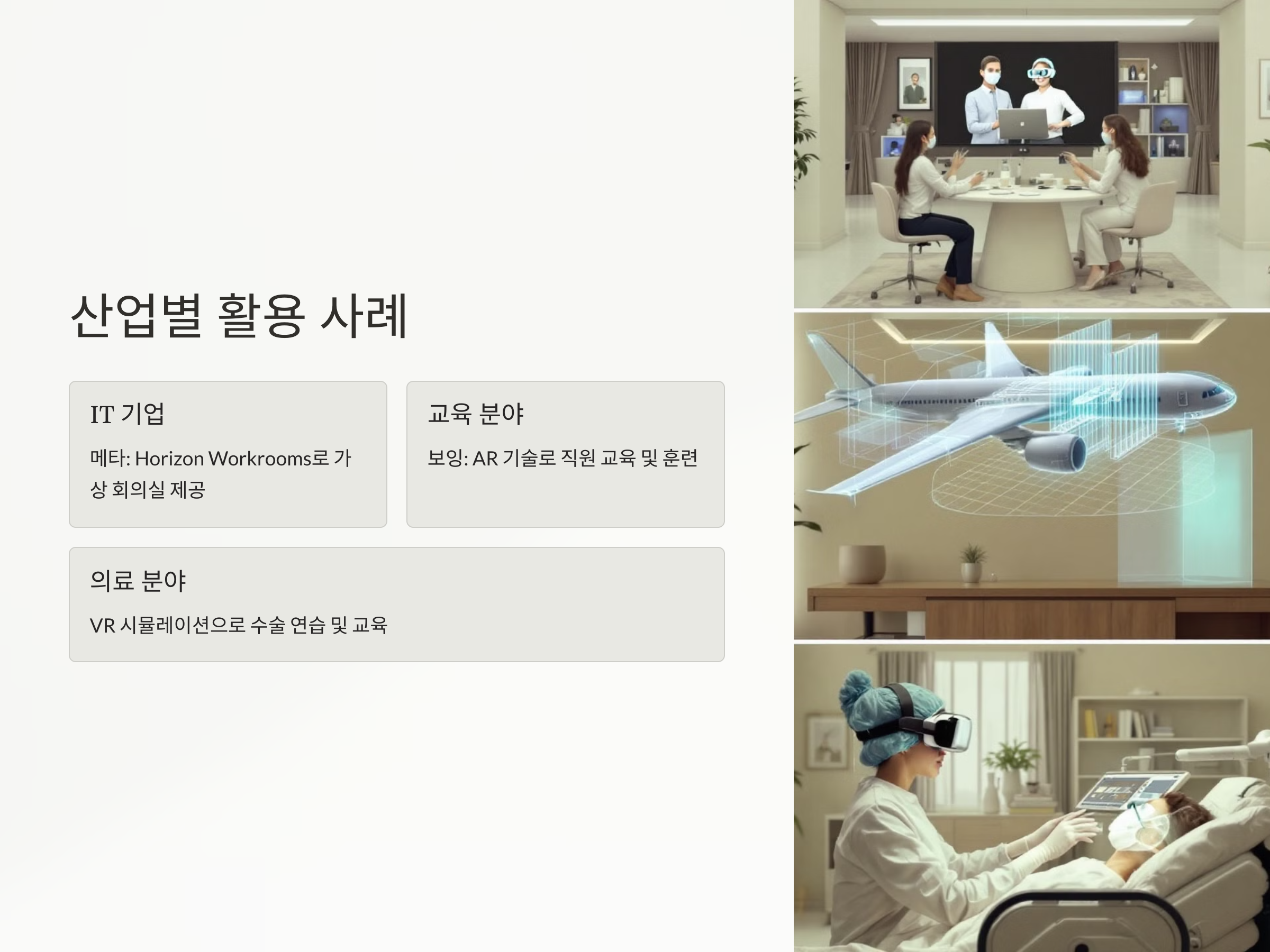 - IT 기업: 메타(Meta)는 Horizon Workrooms를 통해 가상 회의실을 제공하여 원격 팀원 간의 협업을 지원하고 있습니다.